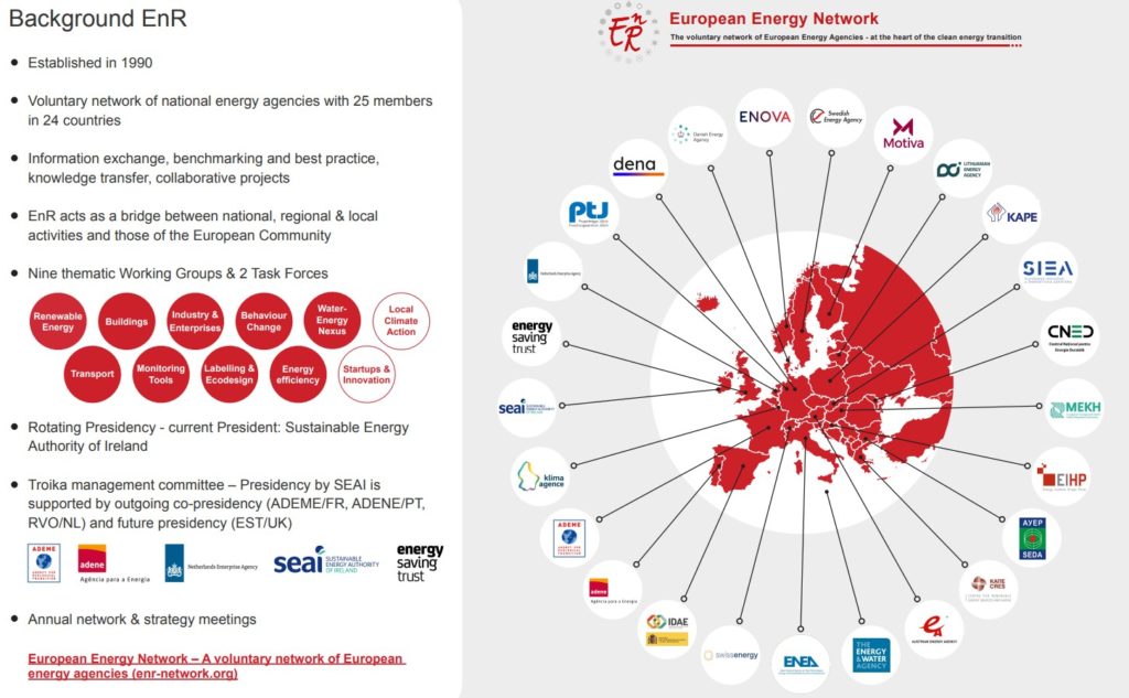 EnR provides a first point of contact for national energy agencies in EU Member States. EnR dedicates its efforts towards joint activities where its unique character provides added value at both a European and individual Member State level. It provides a channel for pan-European technical support on matters of energy policy, strategy, evaluation, programme design & delivery and marketing communications.